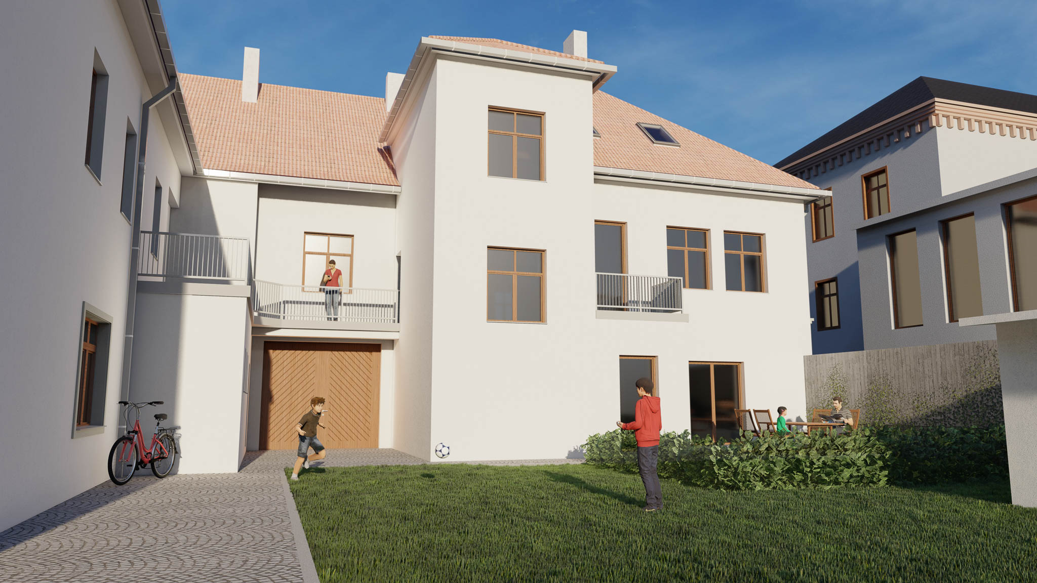V rámci stavebních úprav vzniklo 7 bytů. Dva v přízemí,z toho jeden včetně malé předzahrádky a terasy. V dalším patře se nám podařilo navrhnout 3 byty, a to i díky uvolnění stávajícího bytu nad průjezdem. Směrem do dvora je jeden byt s terasou, v podkroví vznikly 2 větší byty.