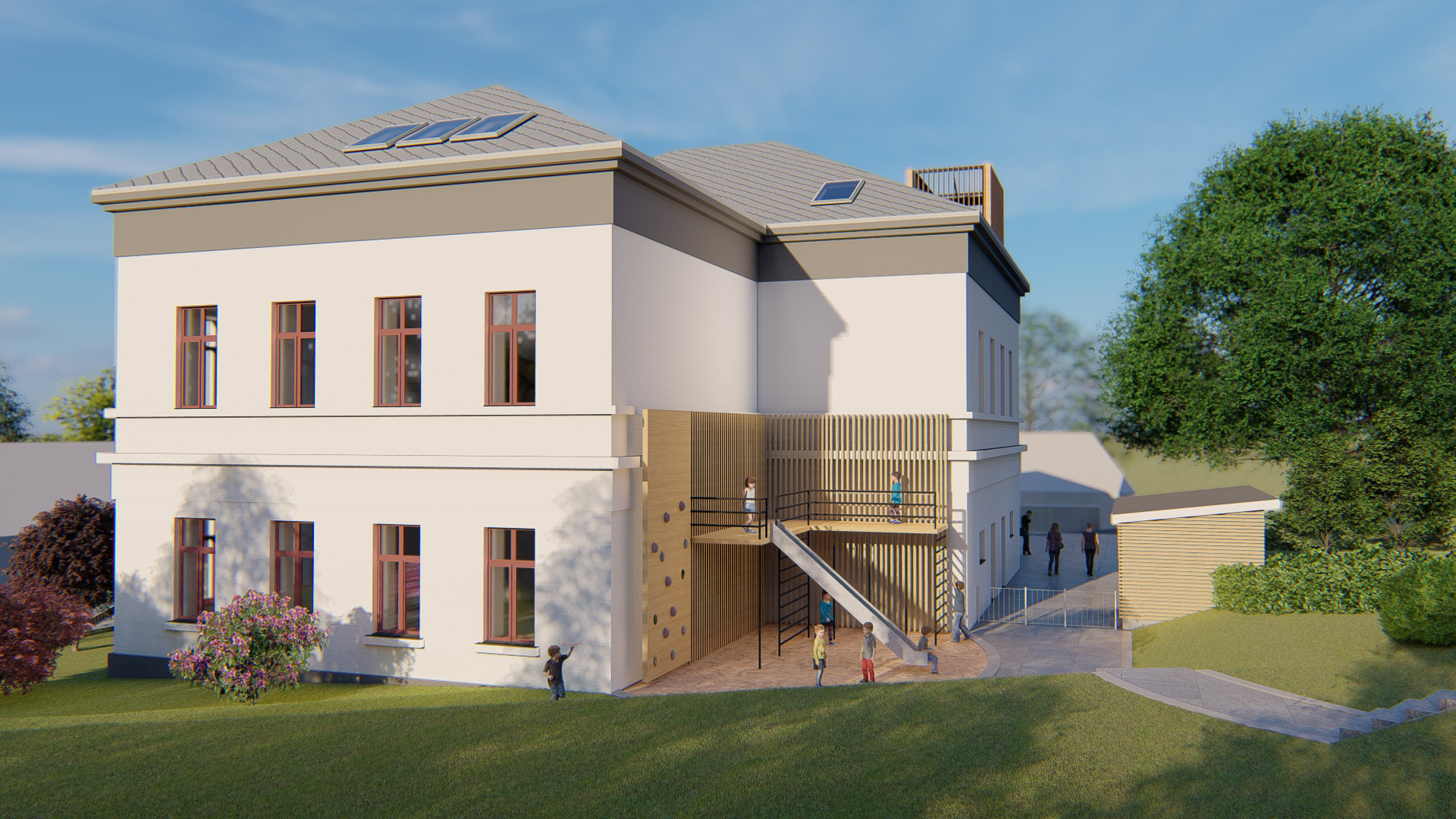 Naše invence spočívá ve využití nového venkovního schodiště pro samotný přístup k podkrovním bytům. Zároveň bude sloužit jako rozhledna. Prostor jsme obohatili o malé náměstí na vyvýšené ploše – ideální jeviště pro venkovní akce jako trhy, obecní slavnosti nebo rozsvícení vánočního stromu. Venkovní posezení umožní grilování a dětské hřiště patřící ke školce bude v odpoledních hodinách místem odpočinku a setkávání pro širokou veřejnost.